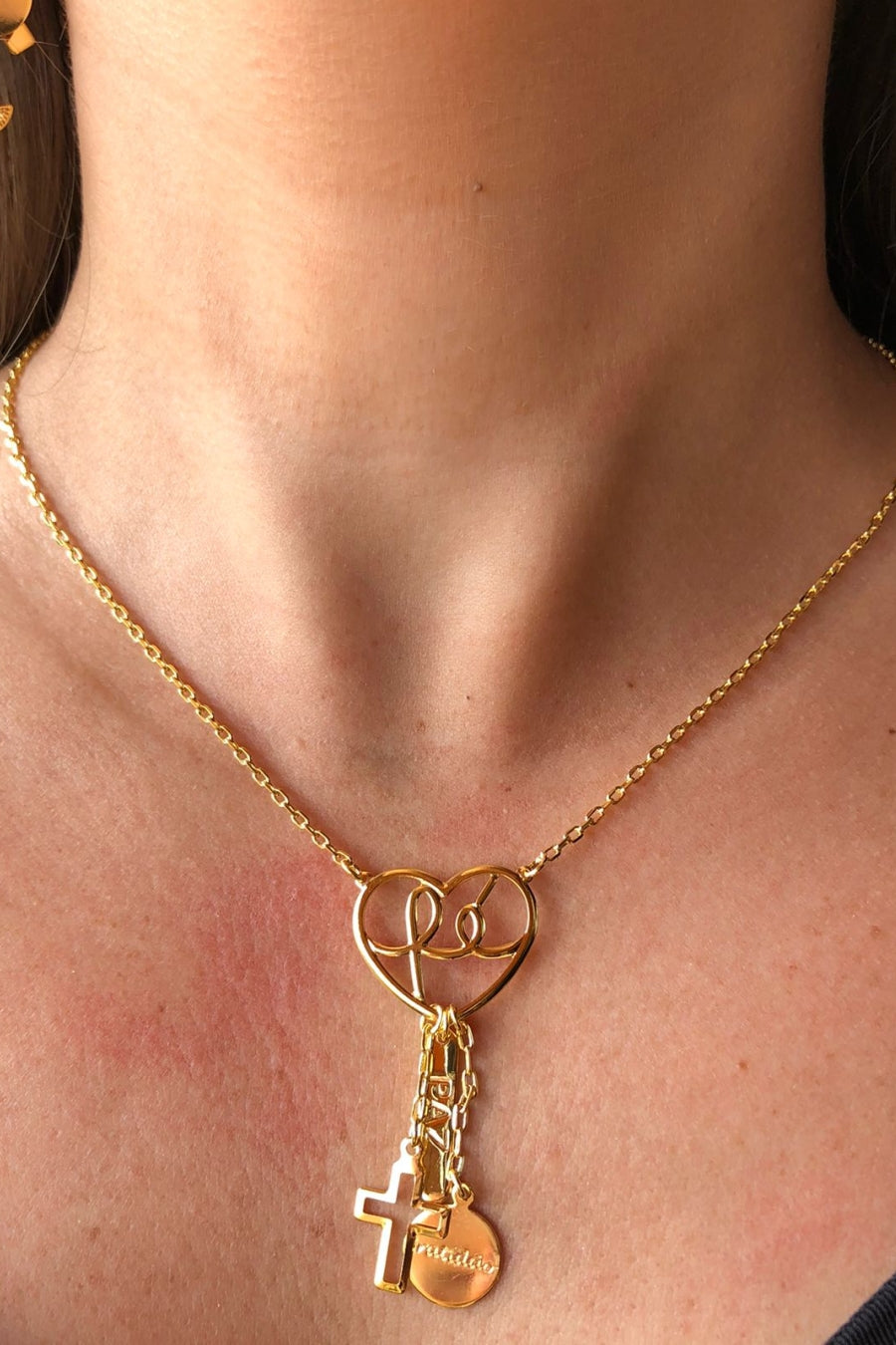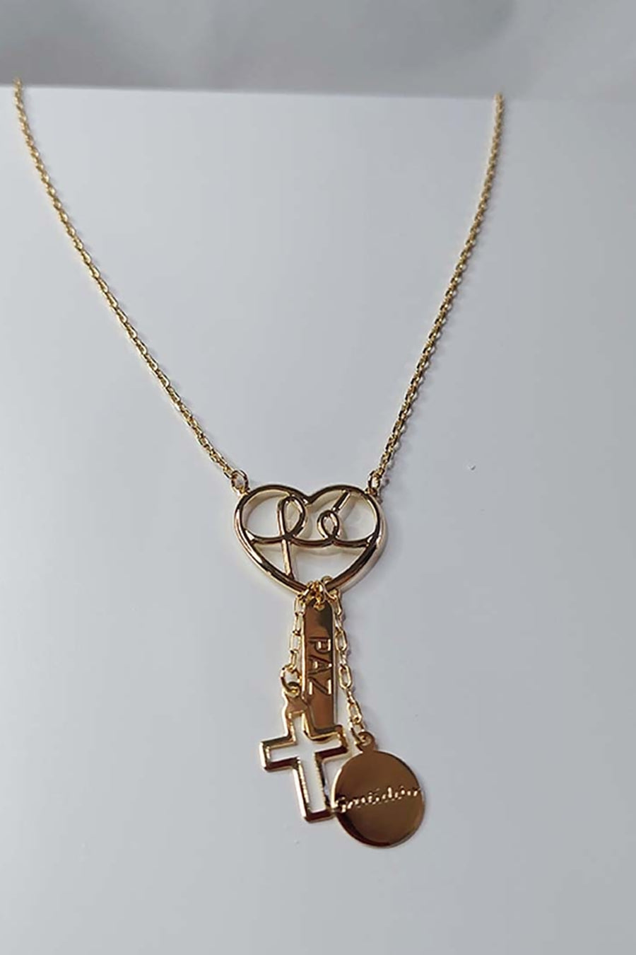 Este colar apresenta pingentes com os símbolos da fé, paz e gratidão, oferecendo um visual espiritual e significativo. Os pingentes são adornados com detalhes delicados, adicionando um toque de elegância e estilo ao seu visual. Banhado em ouro 18k, este colar é uma expressão de crenças pessoais e valores, perfeito para uso diário ou para presentear alguém especial com uma joia carregada de significado.