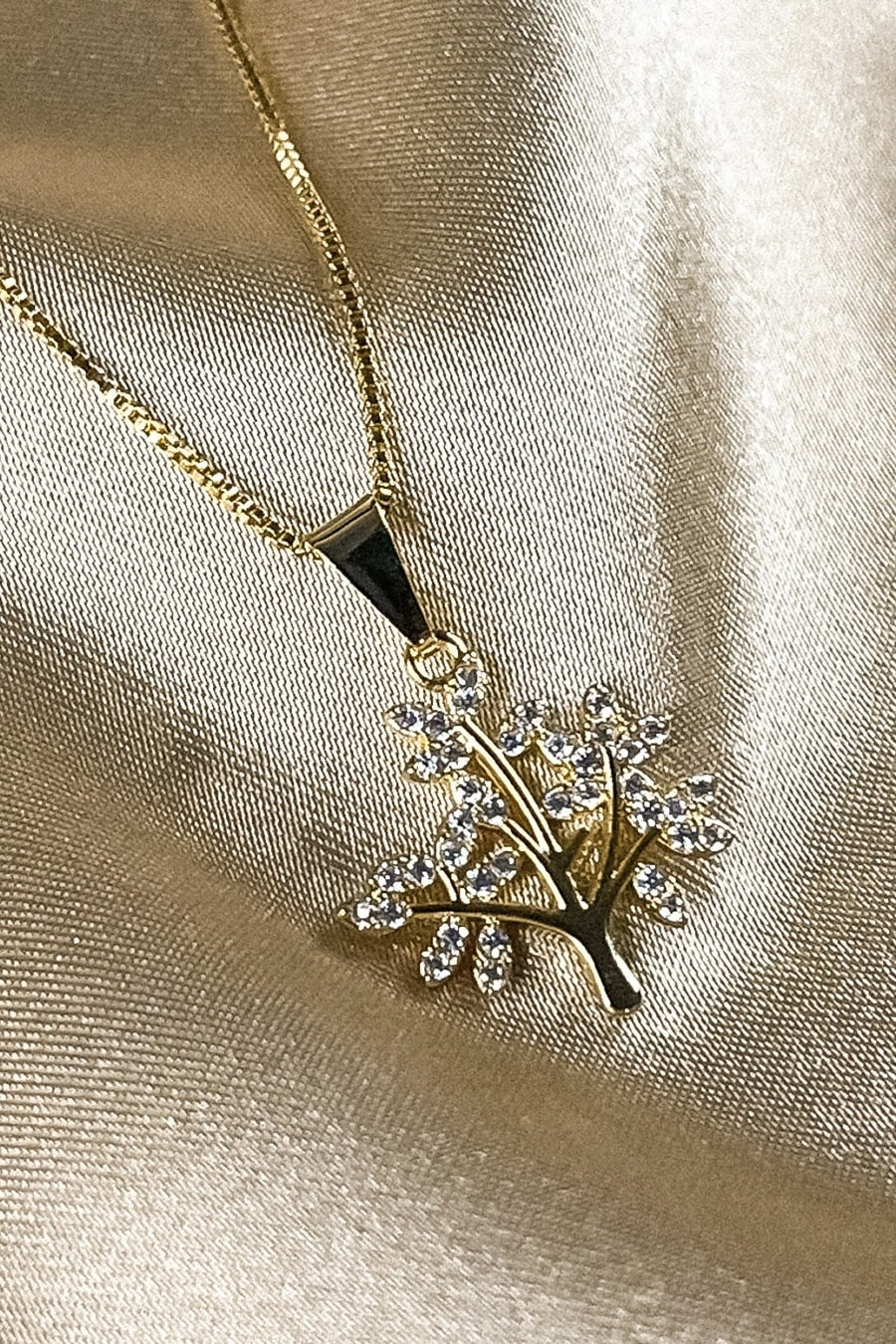 Este colar apresenta um pingente da Árvore da Vida adornado com zircônias brancas, banhado em ouro 18k. O design elegante e simbólico adiciona um toque de brilho e significado ao seu visual, tornando esta peça perfeita para uso diário ou para ocasiões especiais. Ideal para quem busca uma joia cheia de estilo e significado.