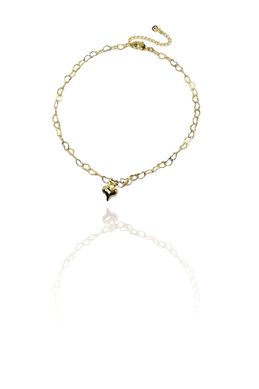 Esta tornozeleira é uma expressão de amor e romantismo. Feita com uma corrente banhada em ouro 18 quilates, ela apresenta um design elegante com corações ao longo de sua extensão, culminando em um pingente de coração charmoso. Perfeita para quem busca uma peça romântica e feminina para complementar seu visual com estilo e sofisticação.