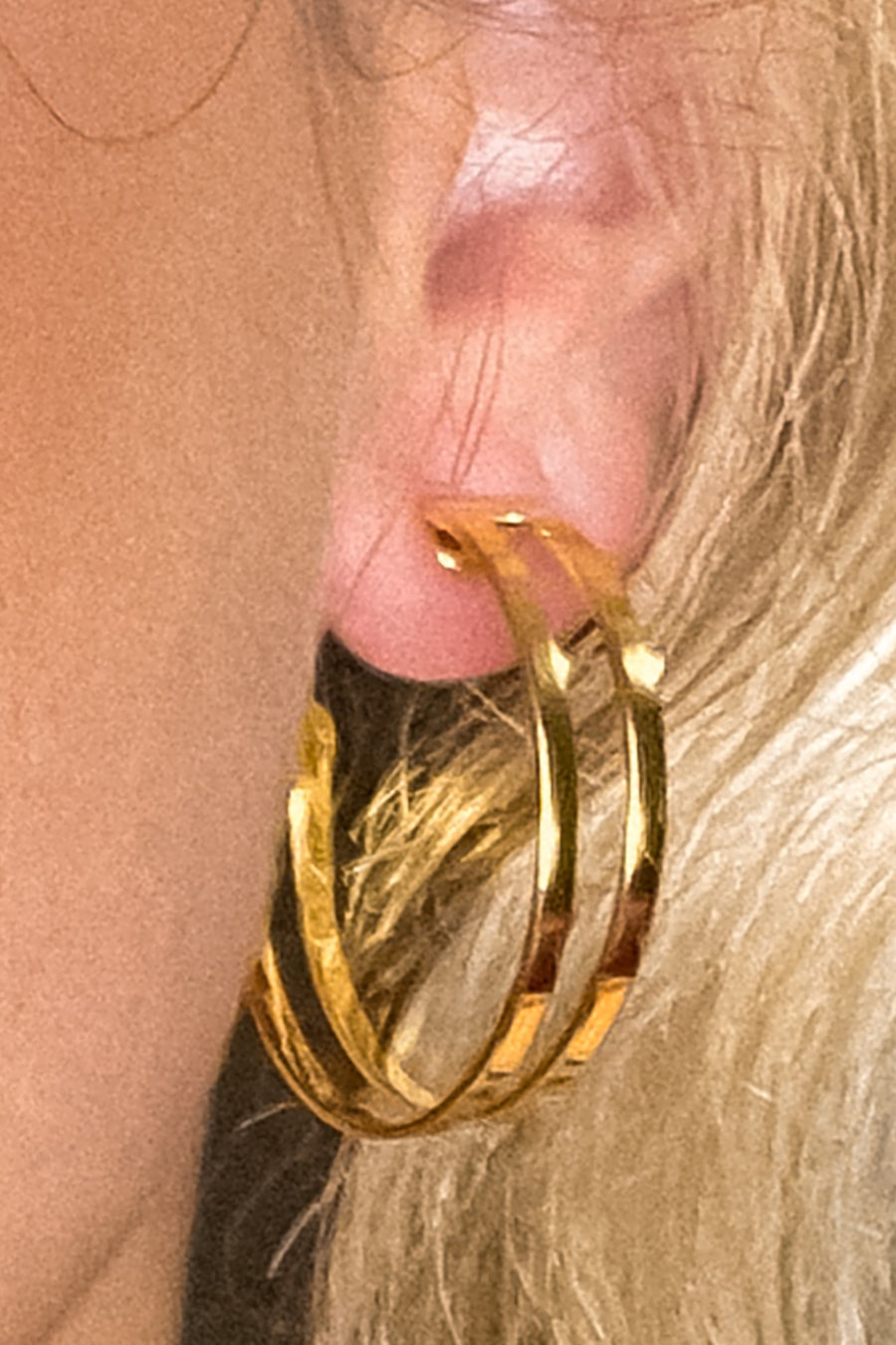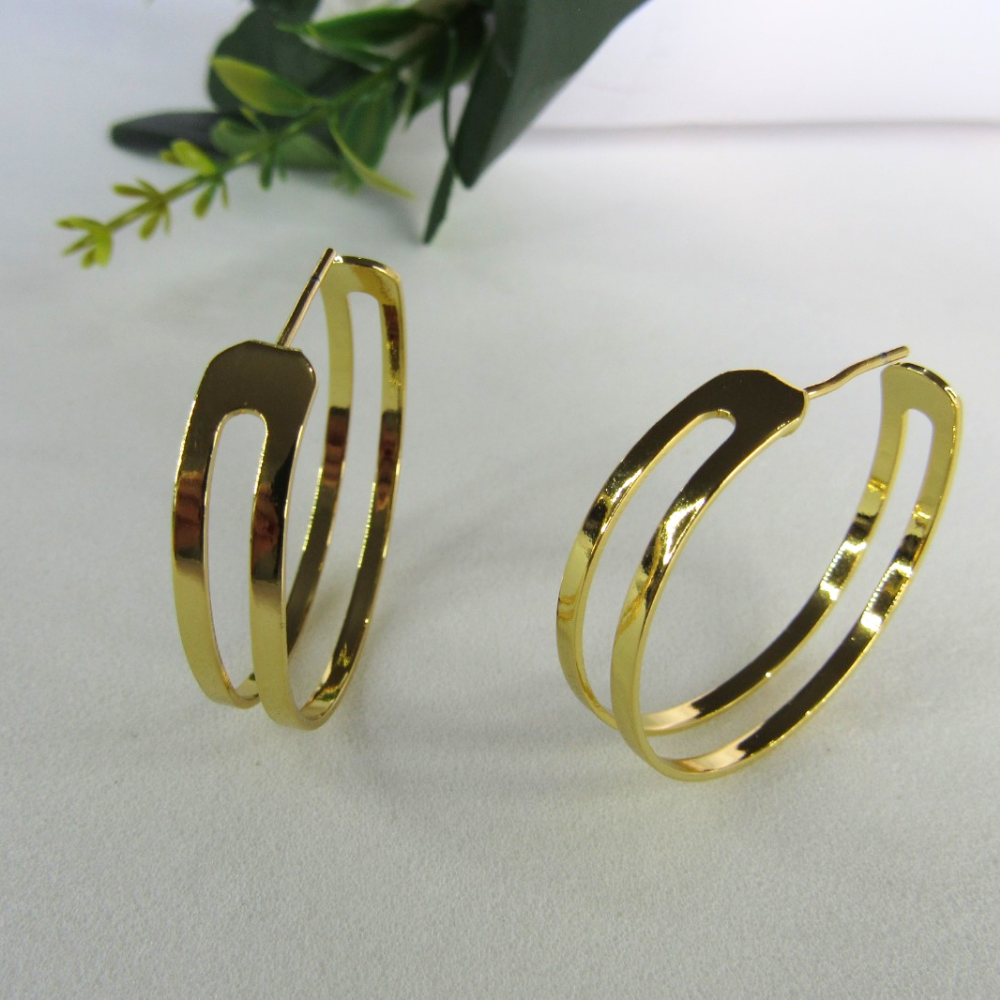 Este brinco apresenta um sofisticado design de argola média dupla vazada, banhado em ouro 18k. O design moderno e elegante é ideal para adicionar um toque de glamour ao seu visual. Perfeito para ocasiões formais ou eventos especiais, este brinco combina beleza e sofisticação. O acabamento em ouro 18k oferece um brilho intenso e durabilidade, enquanto o design vazado adiciona uma textura interessante e visualmente atraente.