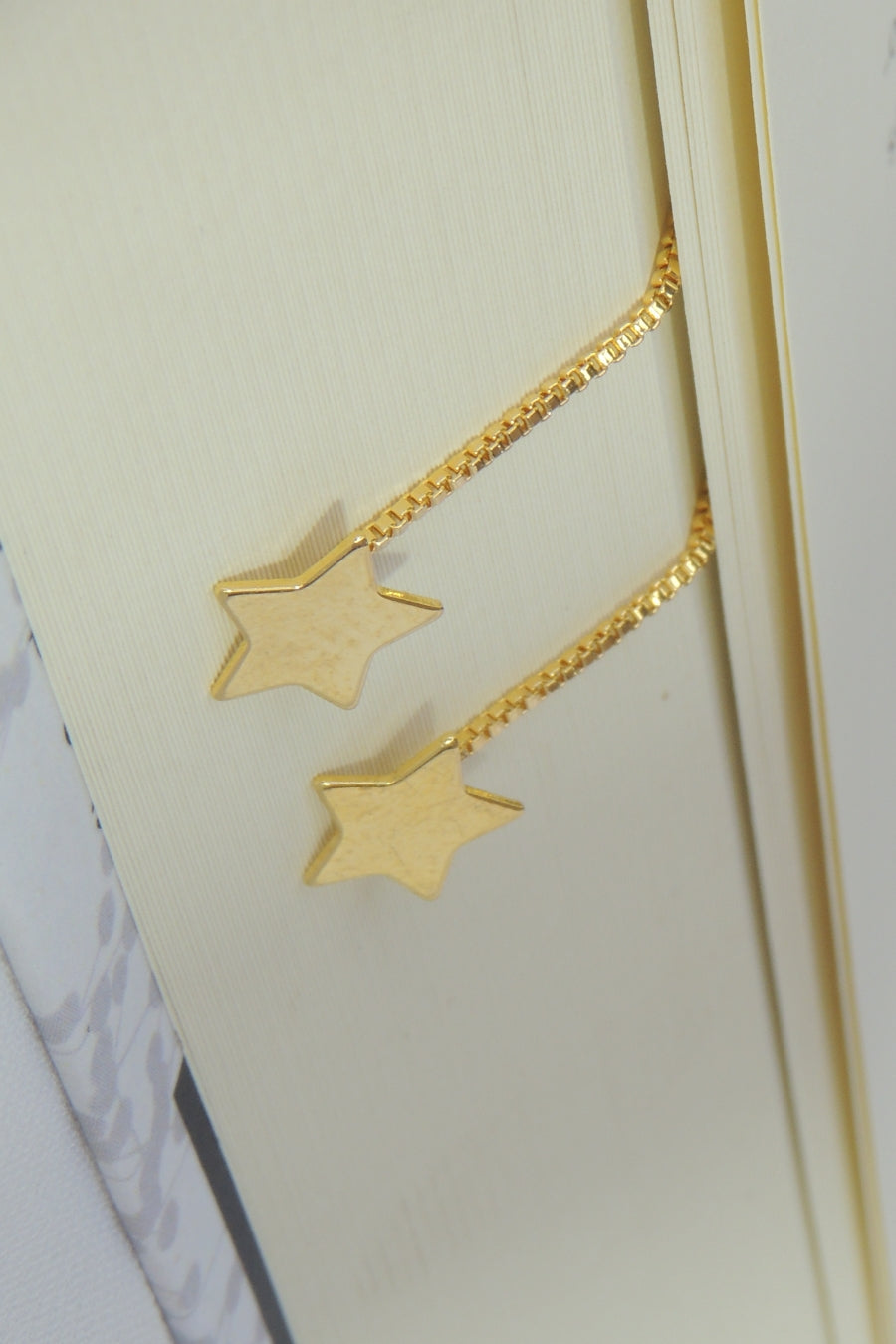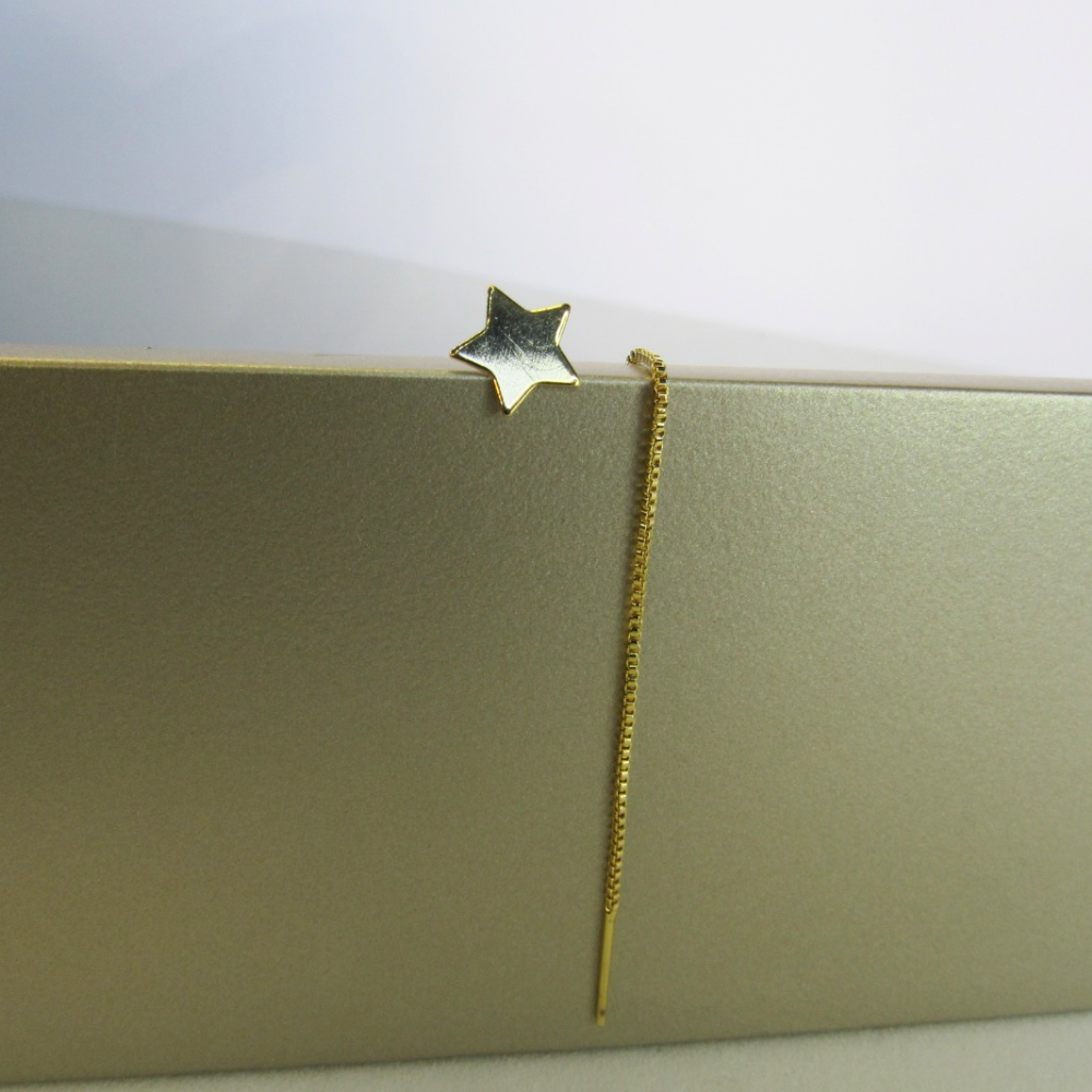 Este brinco apresenta um fio fino com uma estrela, banhado em ouro 18k. O design delicado e encantador adiciona um toque de sofisticação ao seu visual. Ideal para quem busca uma peça única e cheia de significado, perfeita para complementar looks casuais ou formais. A estrela é cuidadosamente polida para um brilho intenso e duradouro.