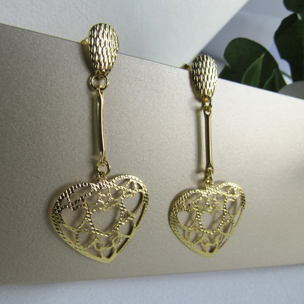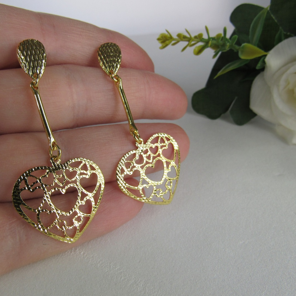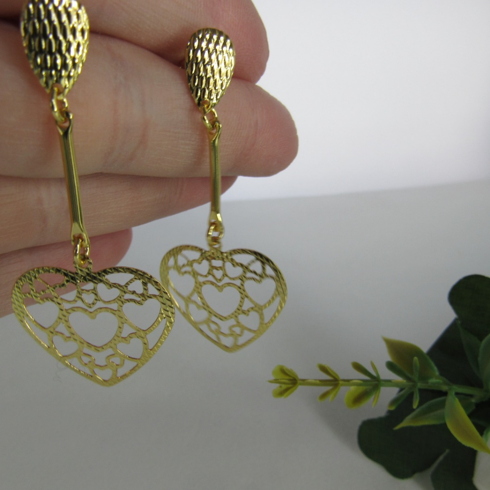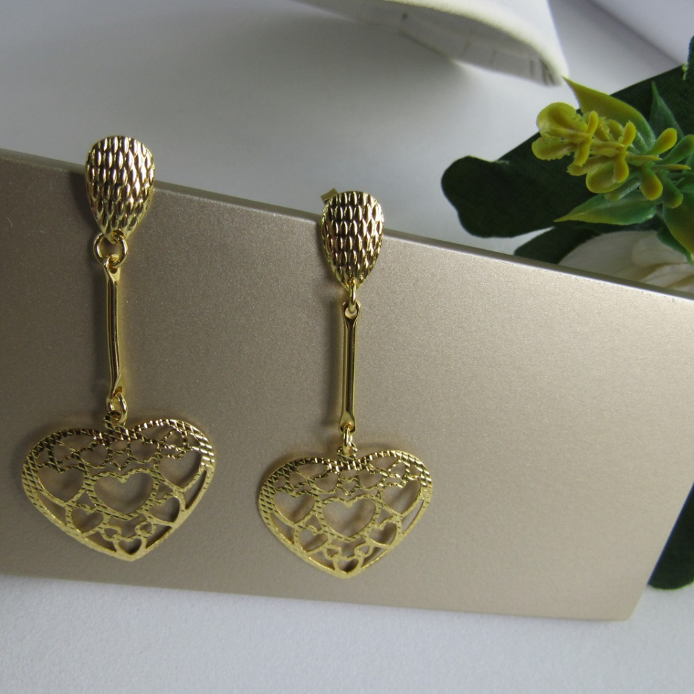 Este brinco médio apresenta encantadores corações vazados, banhados em ouro 18k, oferecendo um visual romântico e delicado. Os corações adicionam um toque de amor e estilo à peça, tornando-a ideal para uso diário ou ocasiões especiais. Perfeito para quem busca uma joia encantadora e cheia de significado, este brinco é uma escolha romântica para expressar seus sentimentos com elegância.