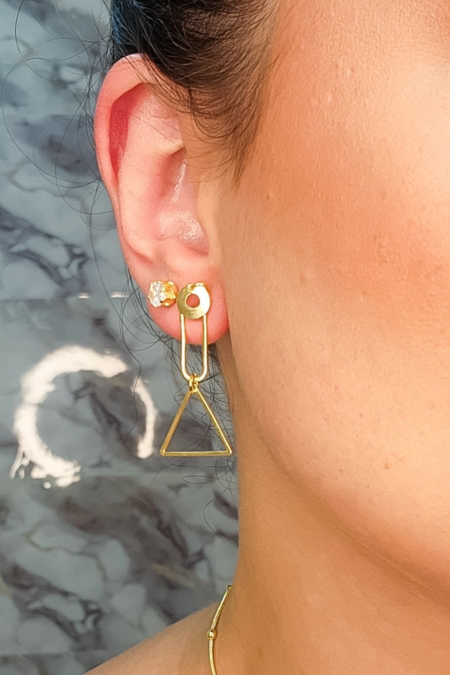 Este brinco médio apresenta um design moderno com formas geométricas,  banhado em ouro 18k. A combinação de diferentes formas geométricas cria um visual contemporâneo e estiloso, ideal para quem busca uma peça única e sofisticada. Perfeito para complementar looks modernos e elegantes, este brinco é uma escolha versátil para qualquer ocasião.