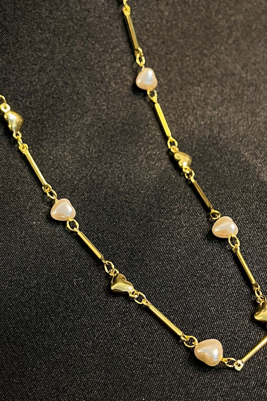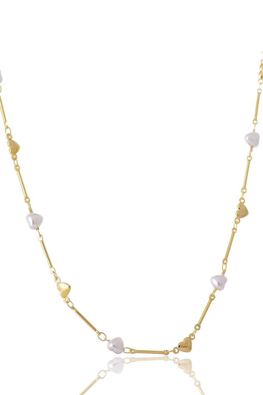 Este colar encantador apresenta pérolas em formato de coração, adicionando um toque romântico e feminino ao seu visual. As pérolas são intercaladas com pequenas contas douradas, criando uma peça elegante e delicada. Banhado em ouro 18k, este colar é uma escolha encantadora para complementar qualquer look com um toque de sofisticação e romance.