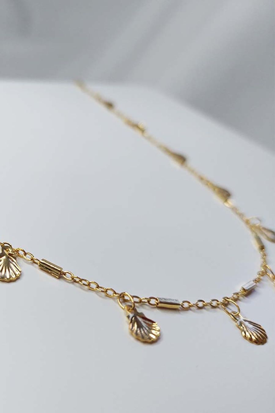 Este colar apresenta uma série de mini conchas ao longo da corrente, todas banhadas em ouro 18k. O design inspirado no mar adiciona um toque de frescor e naturalidade ao seu visual, tornando esta peça ideal para o verão ou para quem adora temas marítimos. Perfeito para um estilo descontraído e elegante.