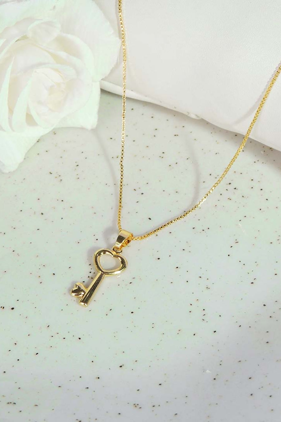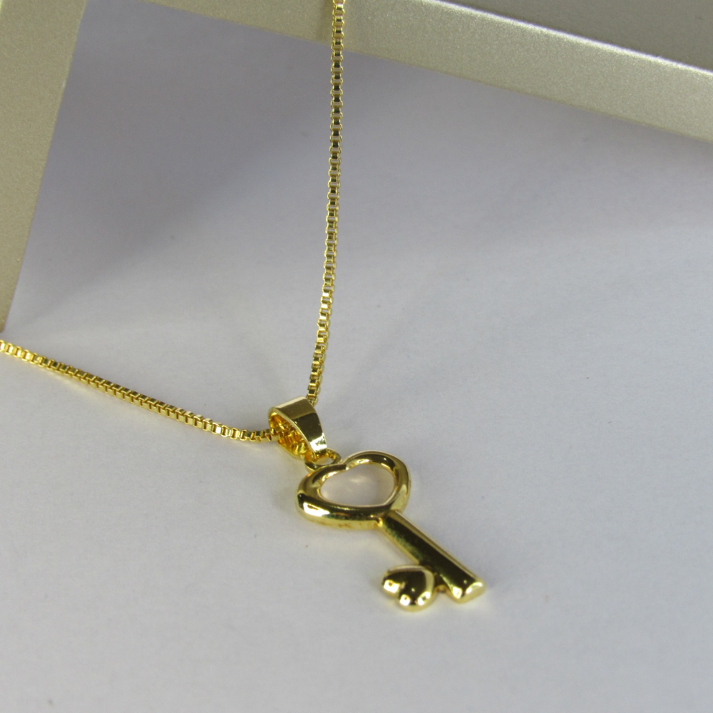 Este colar possui um pingente de chave, banhado em ouro 18k, oferecendo um visual elegante e simbólico. O design delicado e sofisticado torna esta peça perfeita para uso diário ou para ocasiões especiais. Ideal para quem busca uma joia cheia de estilo e significado, representando novas oportunidades e mistérios.