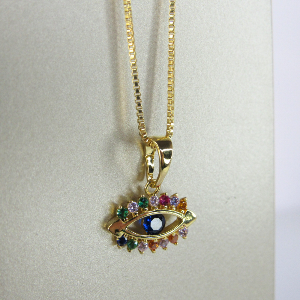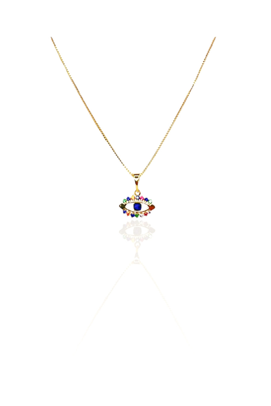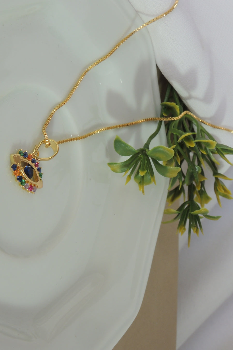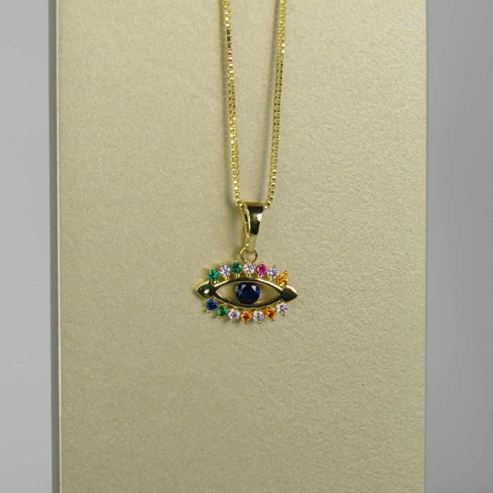 Este colar apresenta um pingente de olho grego adornado com zircônias multicolor, banhado em ouro 18k. O design vibrante e simbólico adiciona um toque de cor e proteção ao seu visual, tornando esta peça perfeita para uso diário ou para ocasiões especiais. Ideal para quem busca uma joia cheia de estilo e significado.