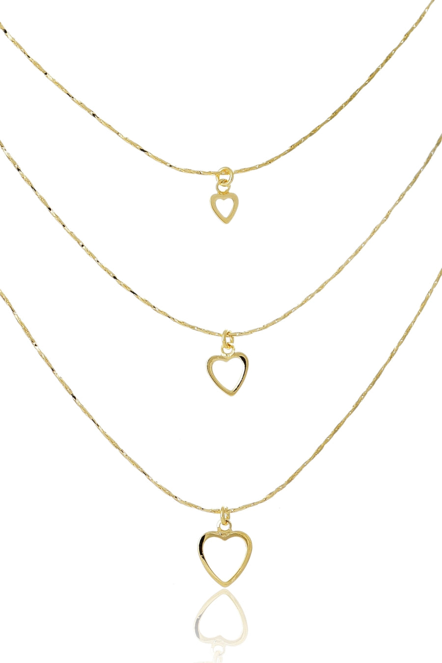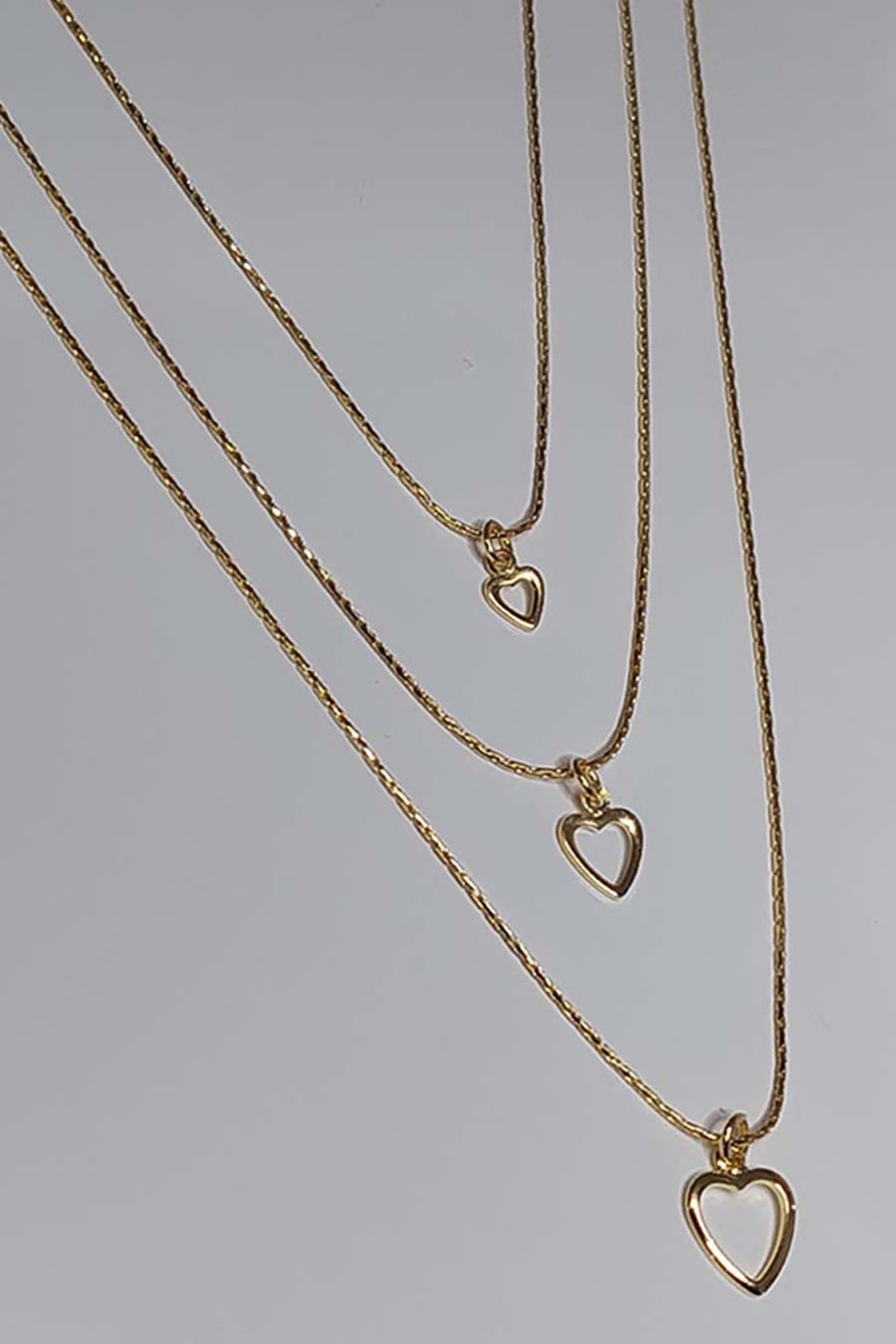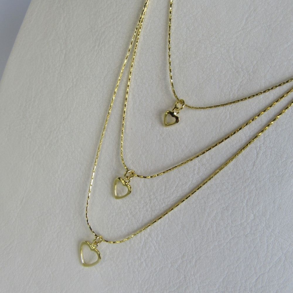Este colar triplo é uma expressão de amor e romance, apresentando três corações vazados banhados em ouro 18k. O design delicado e feminino adiciona um toque de elegância ao seu visual, enquanto os corações transmitem sentimentos de afeto e carinho. Perfeito para uso diário ou para presentear alguém especial com uma peça cheia de significado.