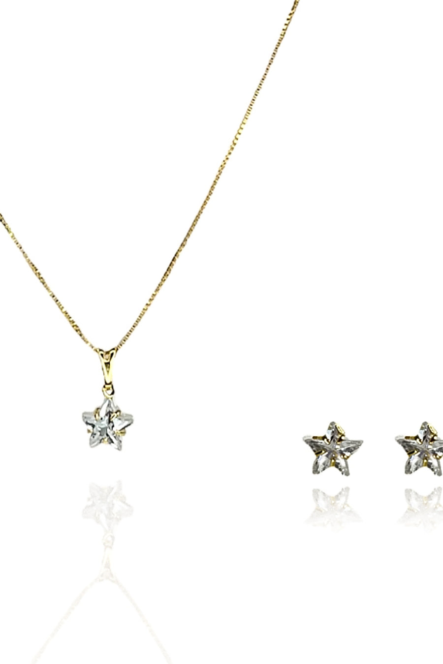 Este conjunto elegante apresenta estrelas com zircônia banhados em ouro 18 quilates, oferecendo um toque de brilho e elegância ao seu visual. Seu design delicado faz dele uma escolha perfeita para adicionar um toque de estilo aos seus looks diários.