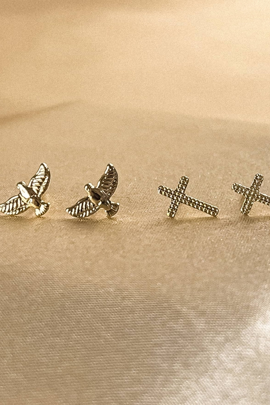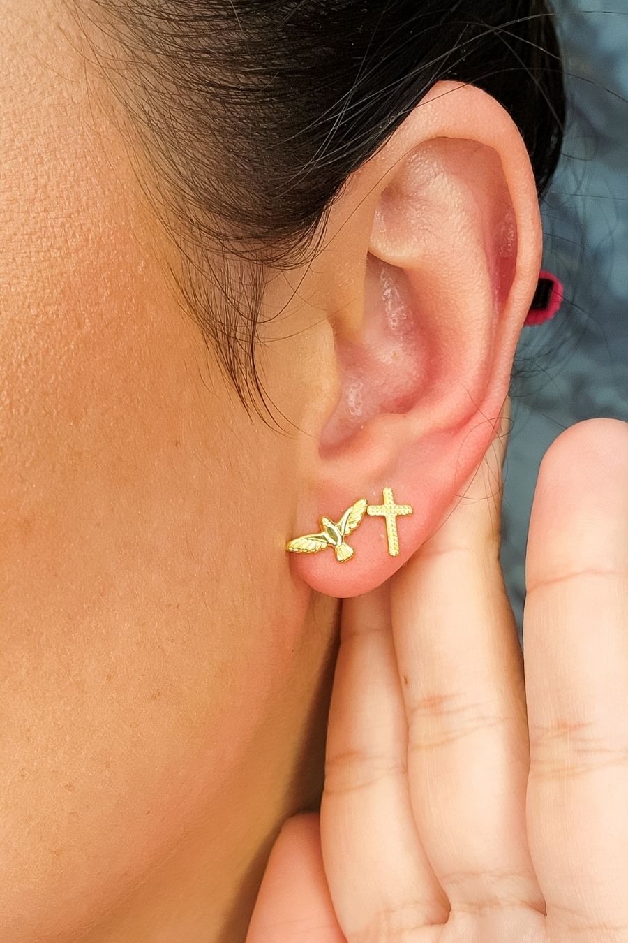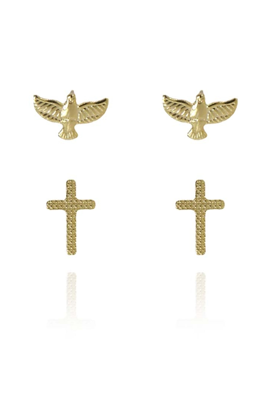 Os brincos Duo de Cruz e Espírito Santo Banhados em Ouro 18k são uma representação de fé e proteção. Este conjunto apresenta duas peças delicadas, cada uma adornada com um símbolo religioso, incluindo uma cruz e o Espírito Santo, ambos banhados em ouro 18k. Com seu design elegante e significativo, esses brincos são ideais para quem busca uma maneira elegante de expressar sua devoção e crença.