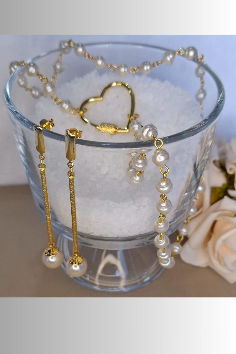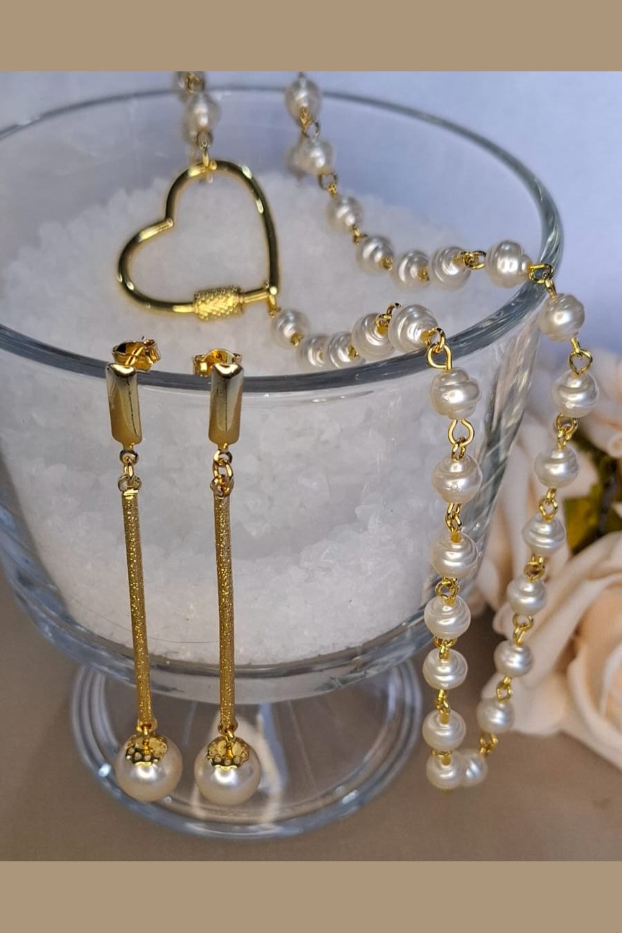 Este colar apresenta pérolas torneadas intercaladas com pequenas contas douradas, complementado por um fecho em forma de coração banhado em ouro 18k. O design clássico e romântico adiciona um toque de elegância ao seu visual, enquanto o fecho em forma de coração confere um detalhe encantador. Perfeito para quem busca uma joia delicada e feminina, este colar é uma escolha encantadora para ocasiões especiais.