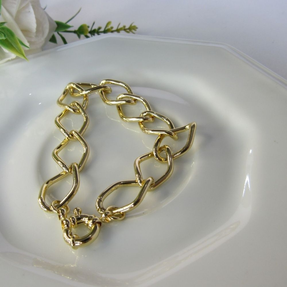 Esta pulseira apresenta elos losango com fecho boia banhado em Ouro 18 quilates, oferecendo um toque de sofisticação e estilo ao seu visual. Sua beleza e elegância fazem dela uma escolha encantadora para complementar uma variedade de looks, do casual ao formal.