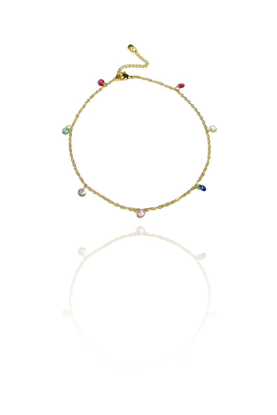 Esta tornozeleira é uma explosão de cor e brilho. Com uma corrente banhada em ouro 18 quilates, ela é adornada com zircônias coloridas deslumbrantes ao longo de sua extensão, criando um visual alegre e vibrante. Perfeita para adicionar um toque de diversão e energia aos seus looks diários, esta tornozeleira é uma escolha ousada e elegante para quem busca destacar-se da multidão.